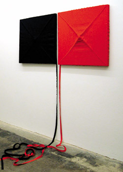 Karin Felbermayr | oberflächenaktive elemente | 03.12.2005 – 20.01.2006 Karin Felbermayr lässt sich in ihrer Kunstpraxis in einen Entwicklungsstrang verorten, der bis in die Neoavantgarde zurückreicht, mindestens bis Adrian Piper. Diese US-amerikanische Künstlerin hat mit ihren Performances in den 70er-Jahren wesentlich dazu beigetragen, der von Männern dominierten Konzeptkunst eine prospektive Wendung zu geben. Den Terminus »oberflächenaktiv« hat sich Felbermayr aus der Chemie entlehnt. Und ist hier im Zusammenhang von Molekülen zu verstehen, welche zwei unterschiedlich strukturierte Enden haben - ein hydrophiles, also wasseranziehendes und ein hydrophobes, d.h. wasserabstoßendes –und sich in einer Flüssigkeit so anordnen, dass das lyophobe Ende möglichst nicht mit Molekülen der Flüssigkeit in Kontakt kommt. Aus diesen Doppelschichten können sich spontan Strukturen bilden, die als Liposome bezeichnet werden. Dabei ist es möglich, dass ein Liposom nur von einer oder aber von mehreren, konzentrischen Doppelschichten gebildet wird. Die erste Entwicklungsstufe zu lebenden Zellen in der Ursuppe waren vermutlich Liposomen, die sich spontan aus Lecithin gebildet haben. Die Ausstellungsbesucher betreten durch einen Eingang mit quadratischen Maßen einen Raum, der auf einer Wand ein schwarzes und ein rotes Quadrat zeigt. Nicht aber wie die bekannten Kunst-Ikonen bestehen diese aus Leinwand und Farbe, sondern aus Reißverschlüssen in den entsprechenden Farben. Anstatt der konzipierten drei Foto-Objekte, ist an die Wand gegenüber ein Provisorium in s/w montiert, das die drei Shoots zeigt, die während einer Performance der Künstlerin entstanden sind. Auch hier fällt wieder, wenn auch mit Durchblicken, die Quadratform ins Auge, die mit einem ebensolchen wandhohen Objekt korrespondiert, das im rechten Winkel von der gegenüberliegenden Seite leicht abgerückt in den Raum ragt. In Material und Farbe mit dem Eingangsbereich identisch, handelt es sich um den Ausschnitt des Eingangs. Alles in allem stellt sich diese Installation auf den ersten Blick als ein Dispositiv der Kunst dar, das formal über die kunsthistorisch bedeutungsschwere Quadratform verlinkt ist. Wäre da nicht das in den Raum ragende Element, das sich auf der Rückseite als Infowand entpuppt, die über eine Pflanze mit dem Namen angelica sinensis Auskunft gibt. Oft wird von Elementen so gesprochen, als seien sie lediglich analytisch identifizierbar, ihre Einheit sei Einheit nur für Zwecke der Beobachtung, der Planung, des Gestaltens. Indem Elemente nur gezählt werden, wird die Beziehung zwischen diesen auf einen quantitativen Ausdruck reduziert. Qualität gewinnen Elemente aber nur dadurch, dass sie relational in Anspruch genommen, also aufeinander bezogen werden, was auch in der Kunst eine lange Tradition hat. Die Künstlerin Karin Felbermayr geht aber darüber hinaus konzeptuell dem Sachverhalt nach, dass und wie ein systemischer Zusammenhang selbst die Elemente, aus denen er besteht, als Elemente qualifiziert. Elemente sind Elemente nur für die Systeme, die sie als Einheit verwenden, und sie sind es nur durch diese Systeme. Was man zählen kann, kann man auch weiter auflösen, sofern ein operativer Bedarf dafür besteht. F.E. Rakuschan, Medienepistemologe